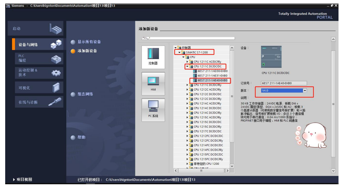 2.打开博图软件,新建项目、添加设备,找到对应设备系列、型号、版本等,添加。