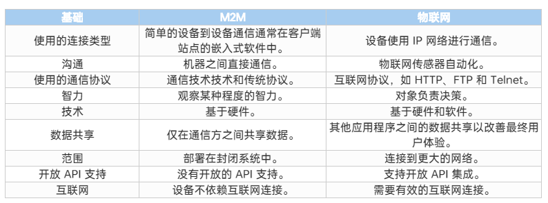 IoT和M2M之间的最大区别在于连接。物联网通常是连接到互联网以增强性能的任何设备。另一方面,M2M通常是两个或多个与互联网连接的设备,用于数据共享和分析。